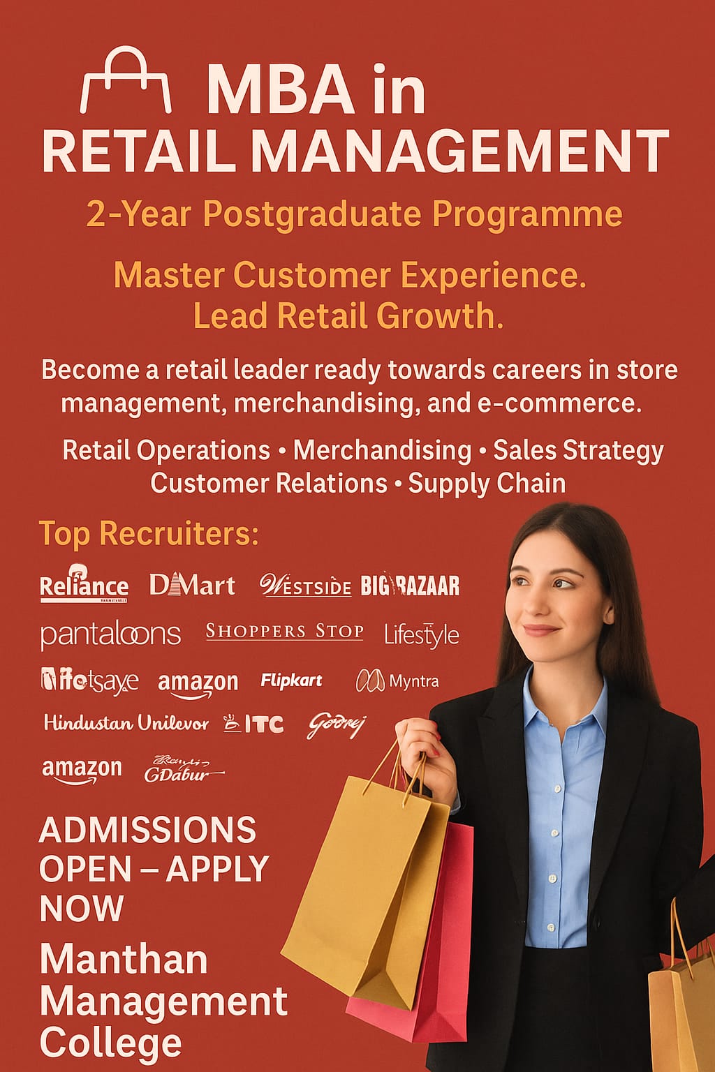 The MBA in Retail Management at Manthan Management College is a 2-year program designed for students who dream of building careers in one of India’s fastest-growing sectors—Retail & E-Commerce.